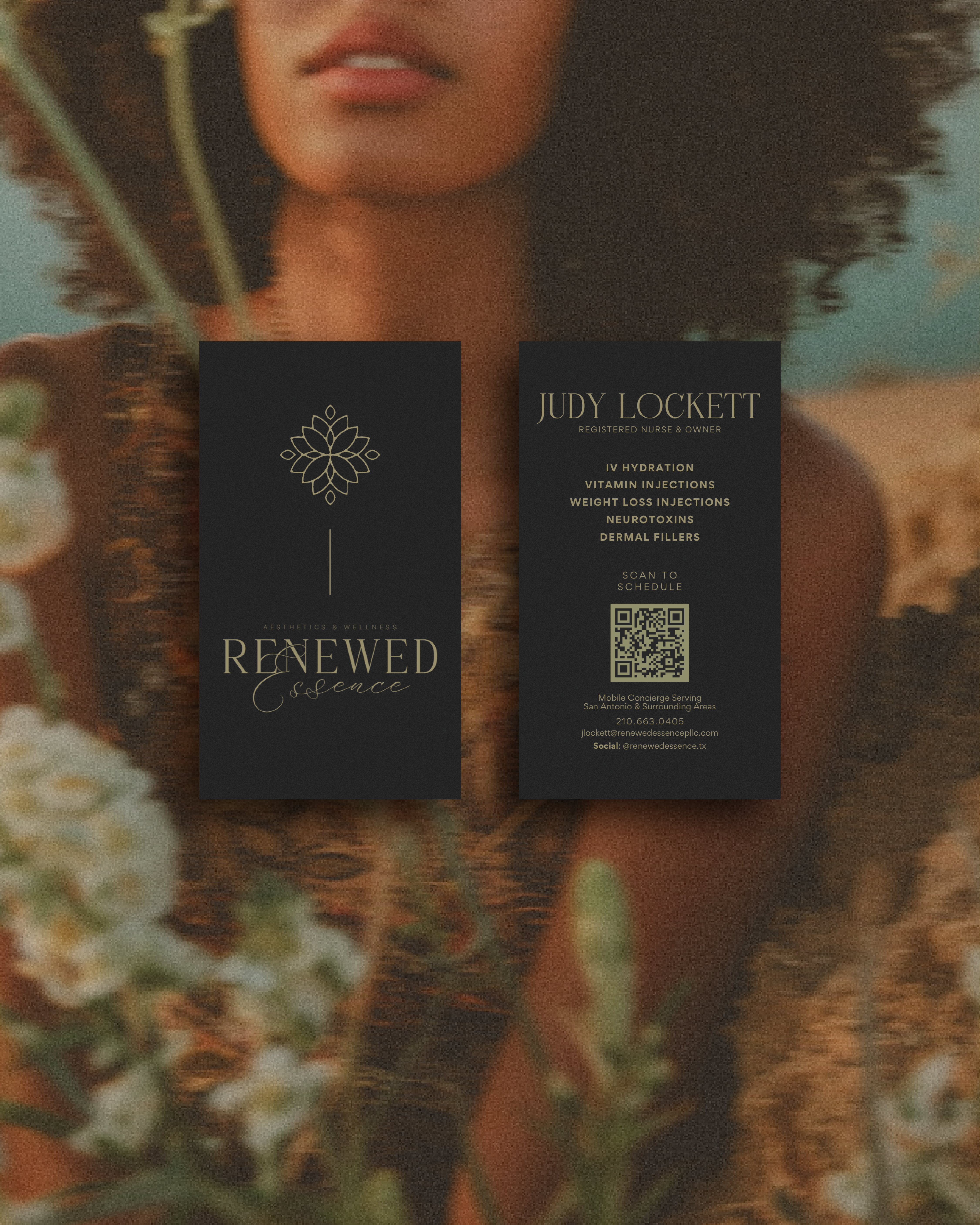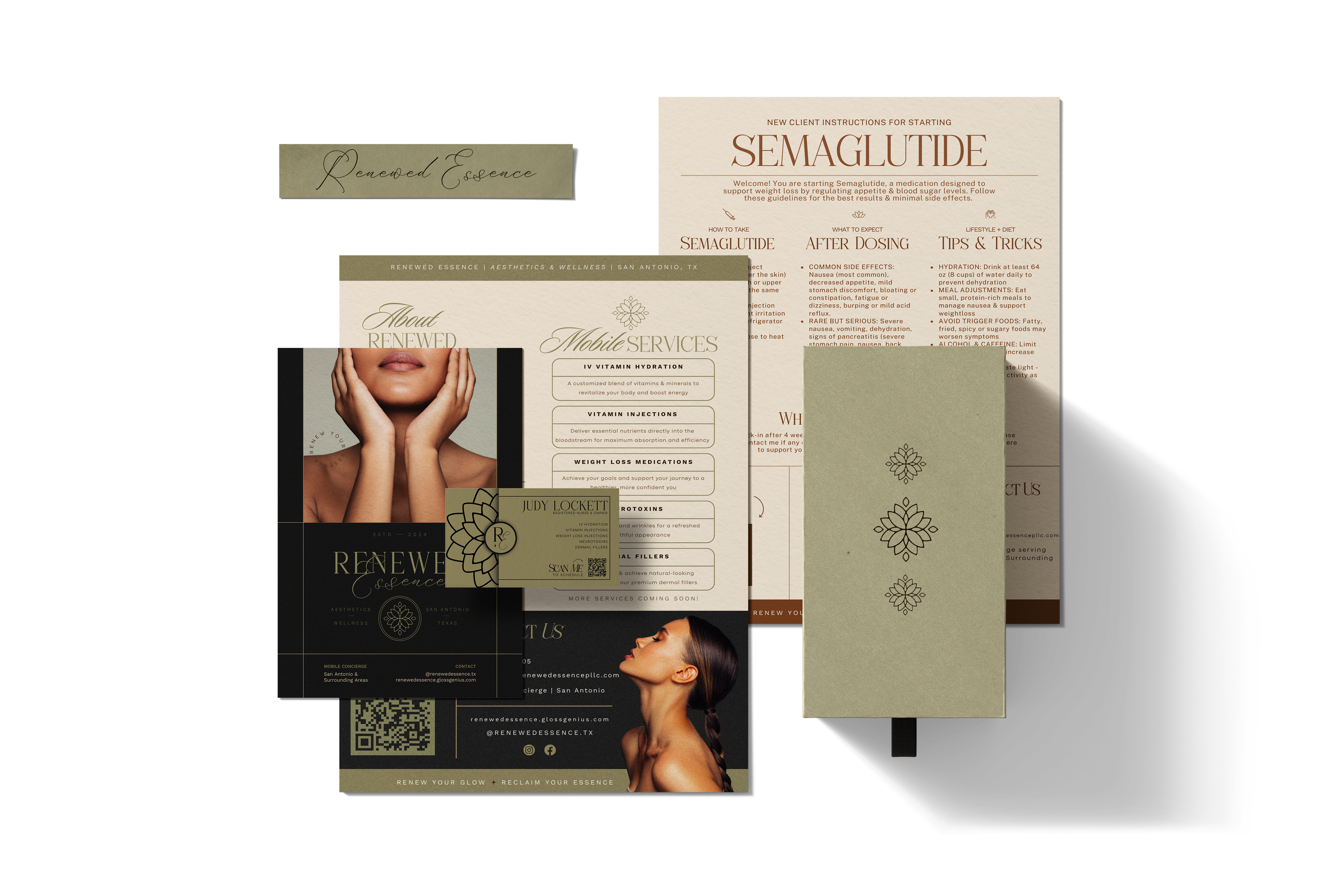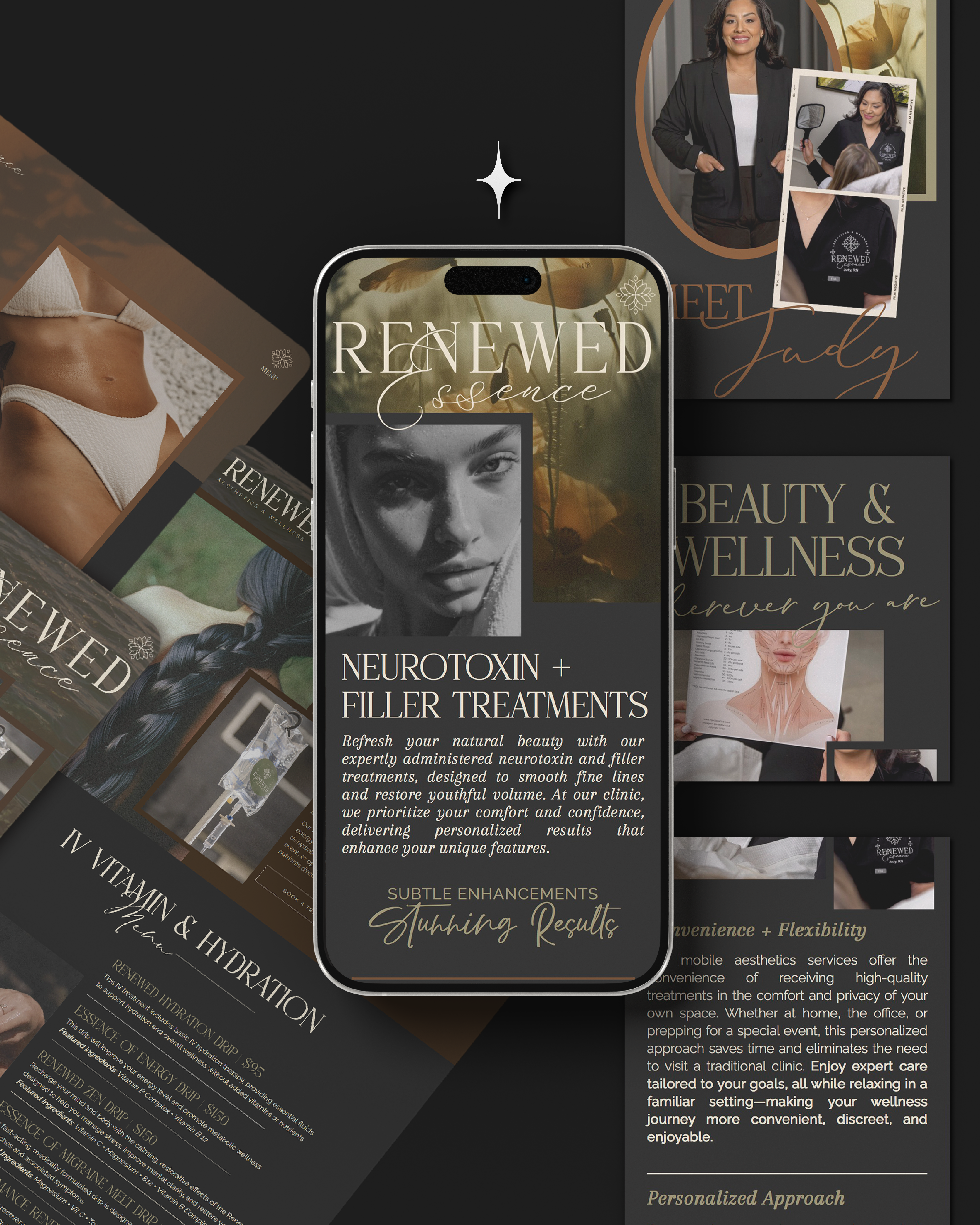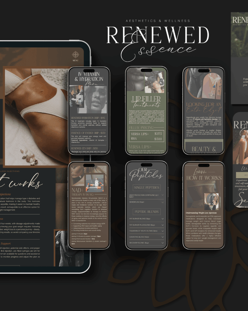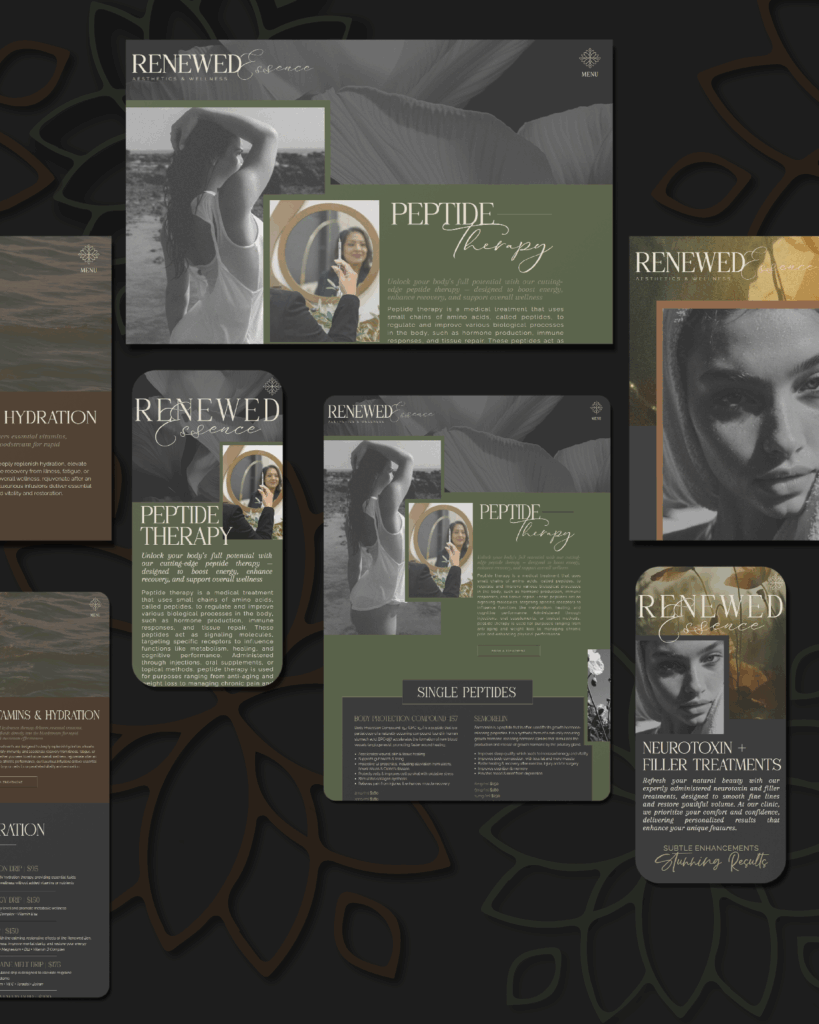 To complement her new website, we also crafted a complete luxury brand identity for Renewed Essence Aesthetics & Wellness. From a sophisticated logo suite and custom color palette to branded patterns, icons, and marketing materials like business cards and flyers, every detail was designed to reflect Judy’s vision of elegance and care. The result is a cohesive, high-end brand presence that feels modern, professional, and perfectly aligned with the luxury wellness experience her clients can expect.